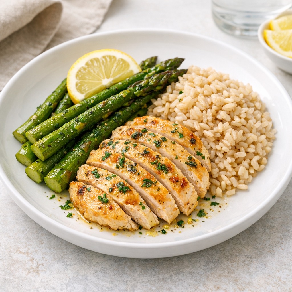 Indulge in our Lemon‑Garlic Chicken with roasted asparagus and fluffy brown rice. This dish features succulent chicken breast, perfectly seasoned with a zesty blend of fresh lemon and garlic, paired with tender, vibrant roasted asparagus and a comforting portion of brown rice. Each bite offers a balanced combination of lean protein, nutrient‑rich vegetables, and wholesome grains to nourish and satisfy.