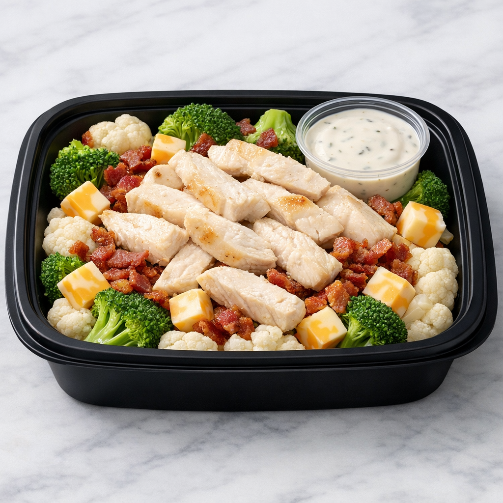 A hearty, satisfying salad built on broccoli and cauliflower florets, topped with tender chicken breast, bacon, and Colby‑Jack cheese cubes. A creamy fat free dressing brings everything together for a bold, comforting plate you can enjoy any day of the week. Dressing is not included in the macros.